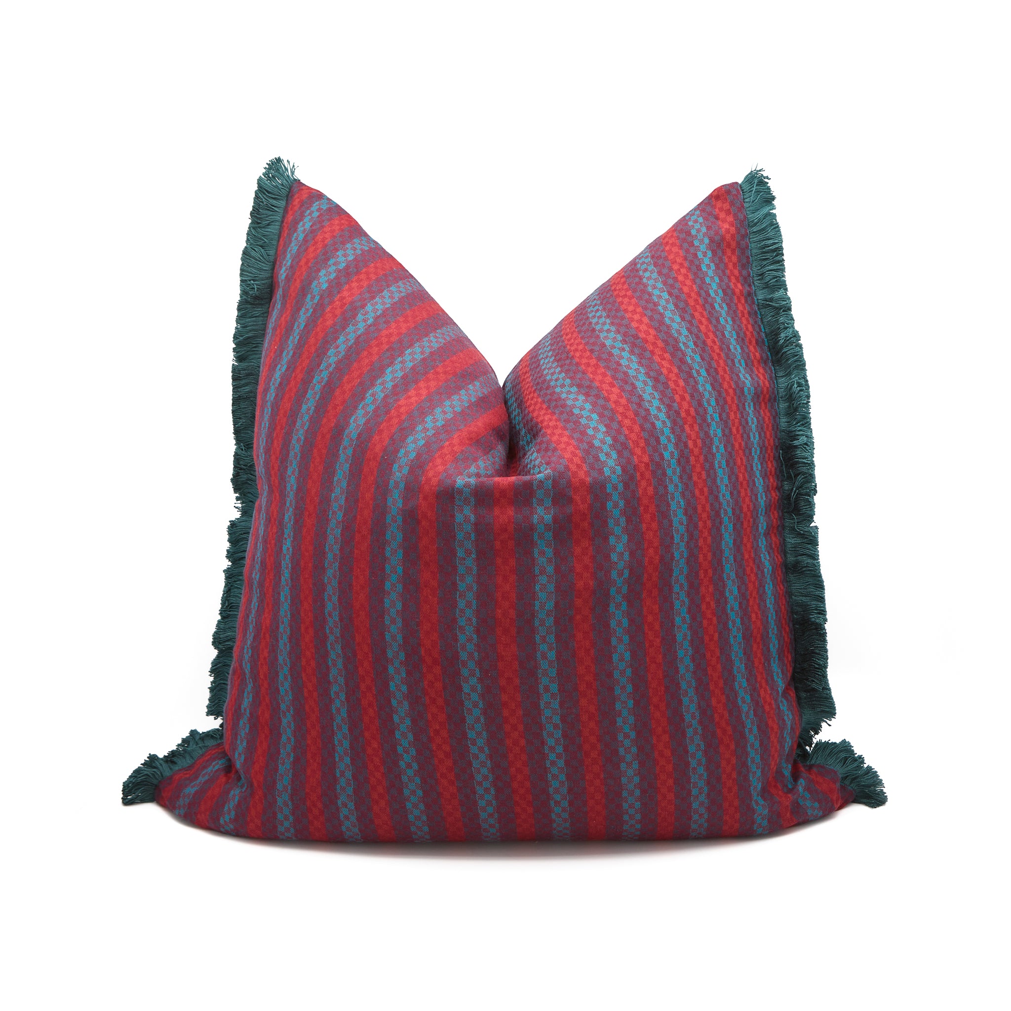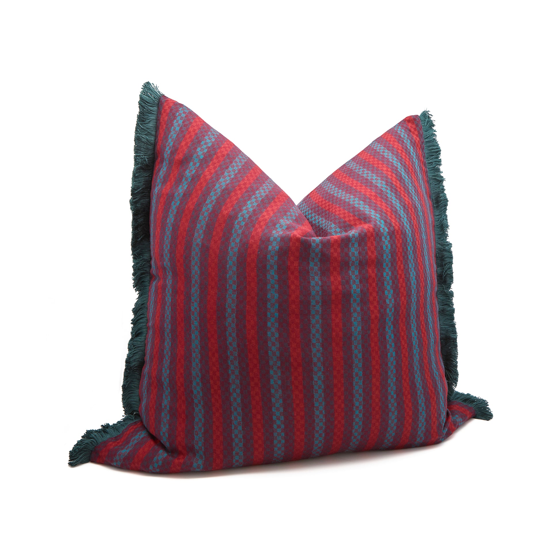 Blue & Red Checkered Stripe Pillow with Teal Fringe · Zip closure at base· Removable insert· Teal fringe on all s...